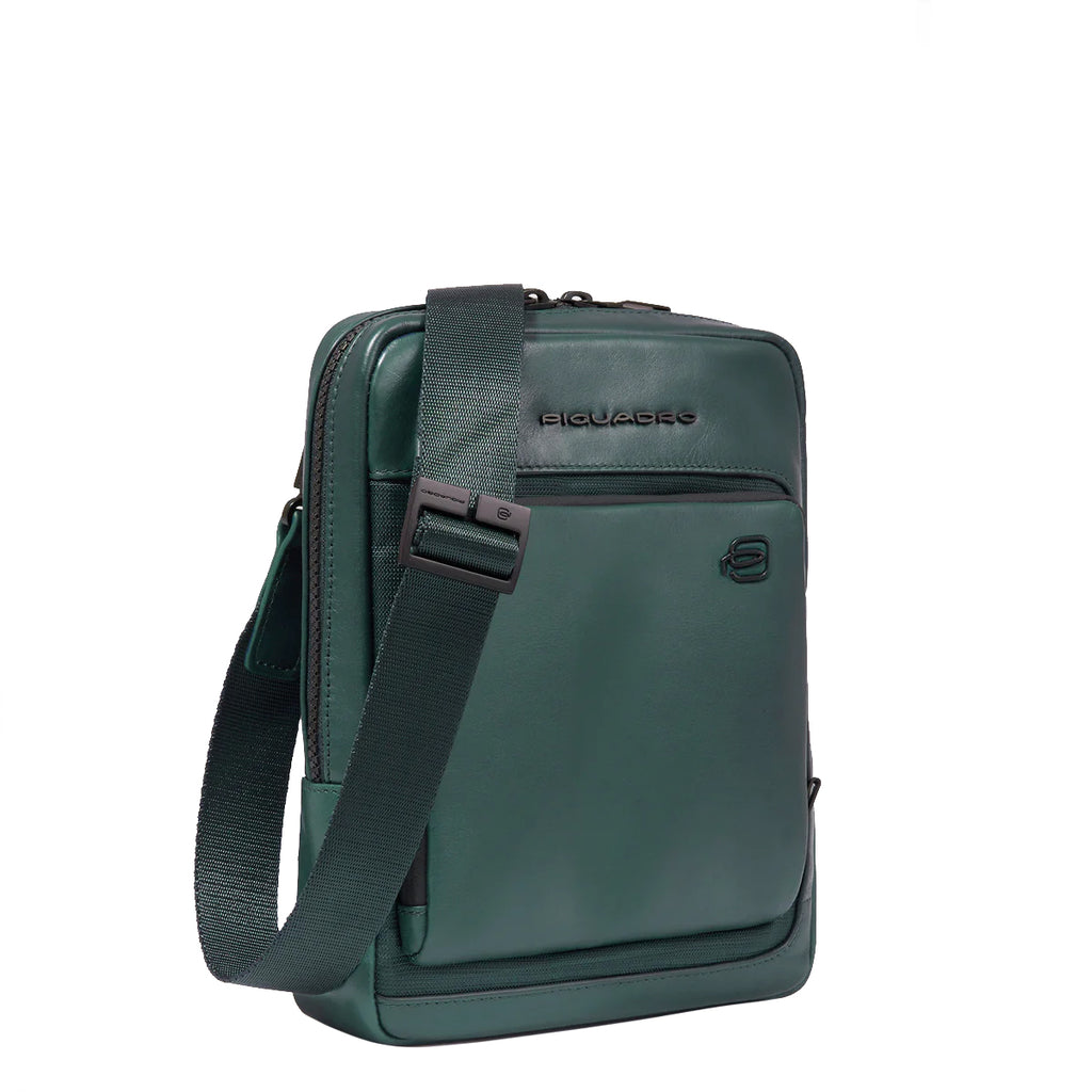 Borsello Liko Piccolo Verde Piquadro, modello in pelle con dettagli in tessuto tecnico e logo in metallo. Tasca frontale con zip, tracolla regolabile in tessuto e comparto principale con cerniera e doppio cursore. Interno foderato completo di tasca porta tablet.
