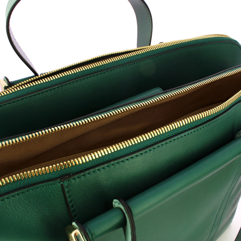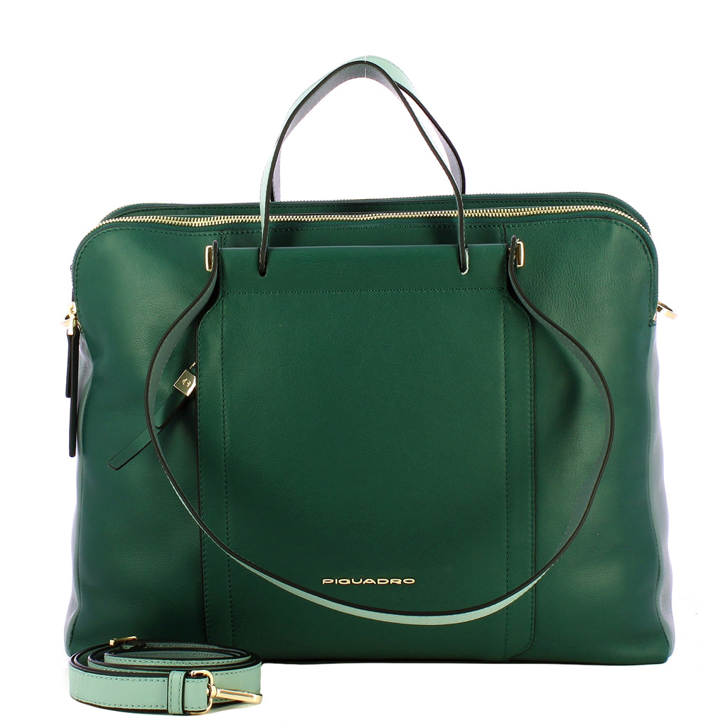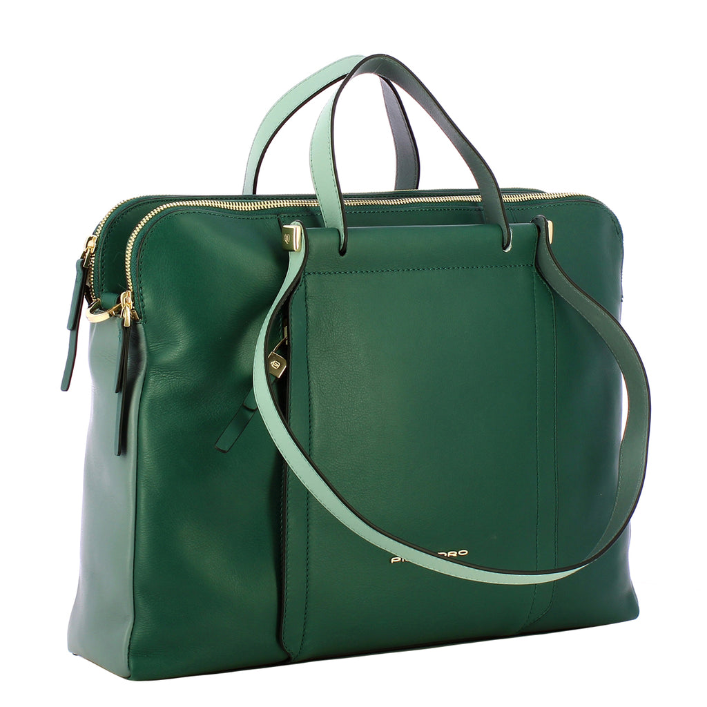 Circle 15" Ottanio Avio Laptop Briefcase Piquadro, elegant genuine leather business accessory. Equipped with two sets of handles, to carry it on the shoulders and by hand, adjustable and removable shoulder strap, metal feet, RFID anti-fraud protection system, and rear trolley attachment strap. Two compartments with zip closure, lined interior, multifunctional pockets, and padded 15" laptop sleeve.