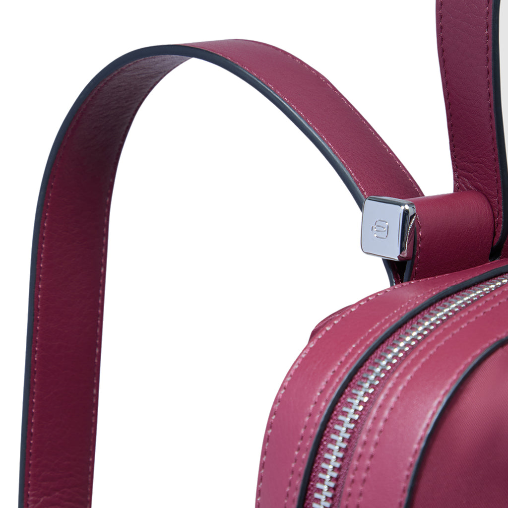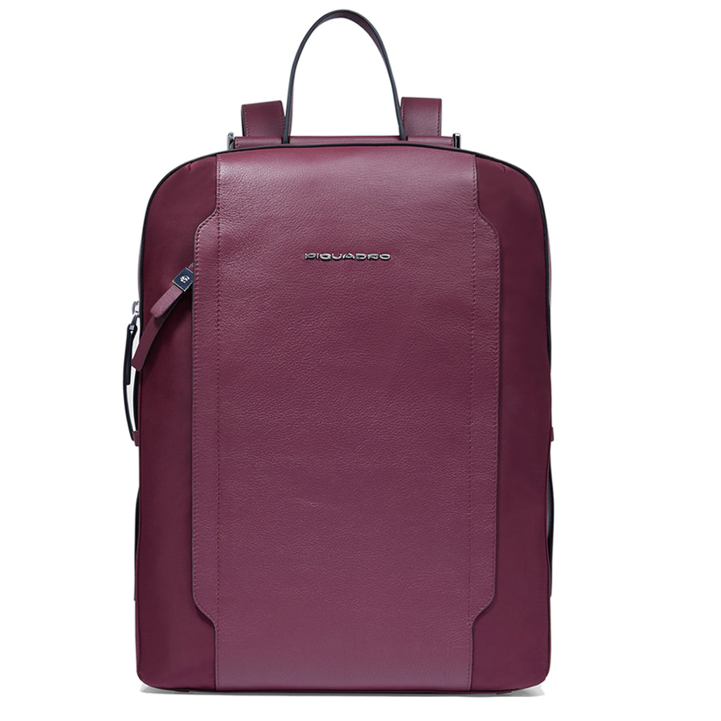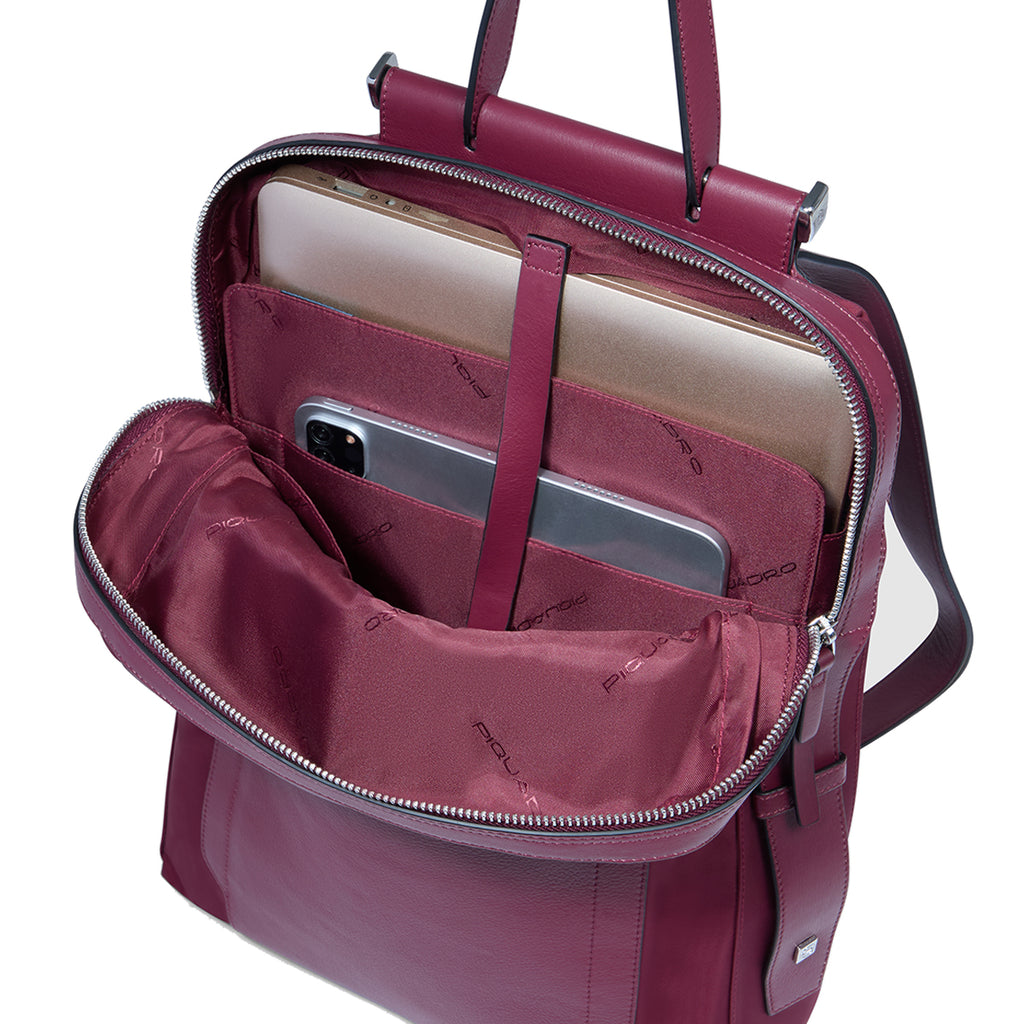Lyra Bordeaux 14" Laptop Backpack Piquadro, women's business accessory made of durable fabric and fine leather with metal lettering logo. Accessory defined by a compact design yet it is spacious. Equipped with top handle, adjustable flat shoulder straps, and trolley attachment strap. External pockets and compartment with zip closure. Lined interior with 14" laptop sleeve.