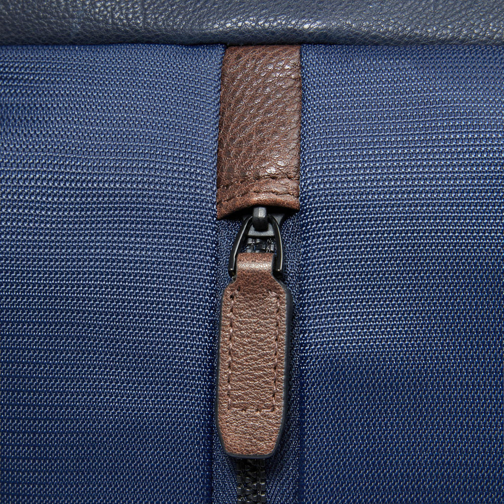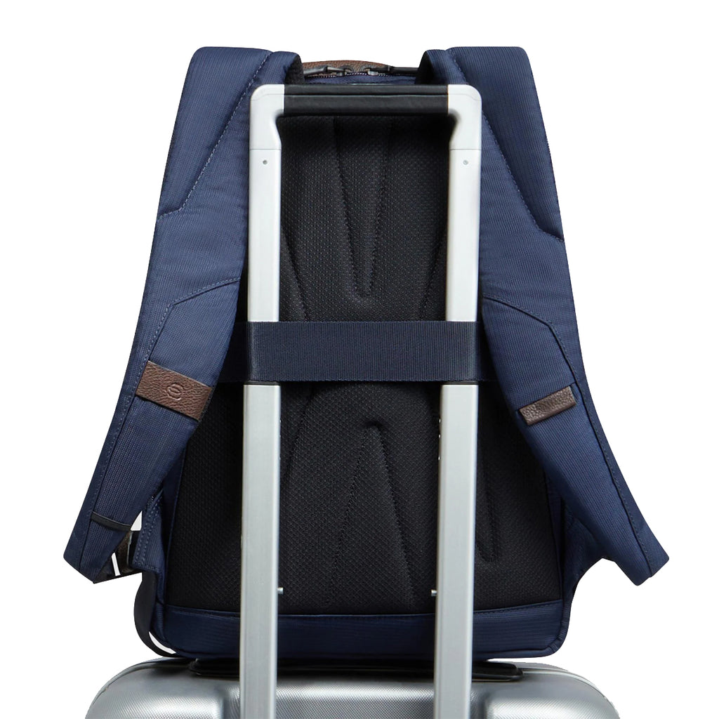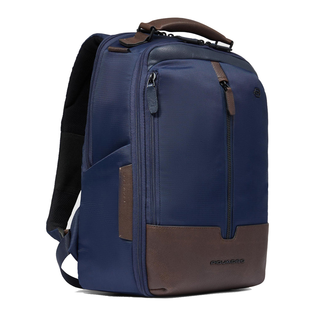 Marcel 14.0 Blu Testa Moro Laptop Backpack Piquadro, functional, business and travel accessory made of recycled synthetic fabric with leather details. Equipped with adjustable padded shoulder straps, rear trolley attachment strap, and front zippered pocket. Main compartment with zip closure, lined interior, pockets, and padded 14" laptop sleeve.