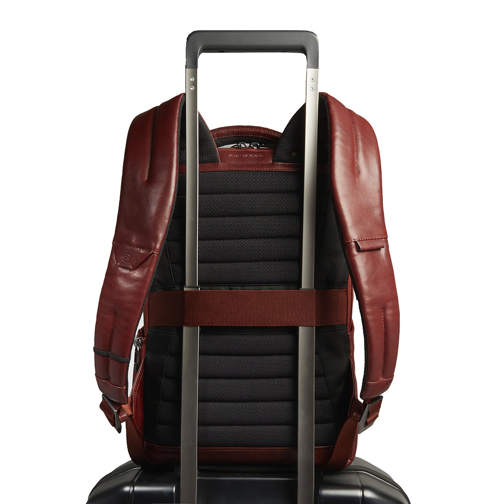Philip 14.0 Marrone Laptop Backpack Piquadro, elegant, smooth leather, business accessory with three zippered pockets, padded top handle and shoulder straps, ergonomic back panel, and trolley attachment strap. Main compartment with zip closure, interior organised with pockets, and padded 14" laptop sleeve.