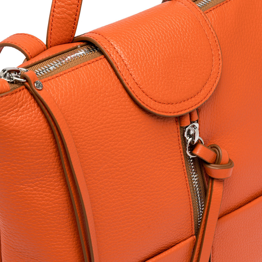 Giada Corallo Backpack Gianni Chiarini, spacious and elegant hammered leather accessory with top handle and adjustable shoulder straps. Compartment with zip and magnetic flap closure, lined interior and zippered pocket.