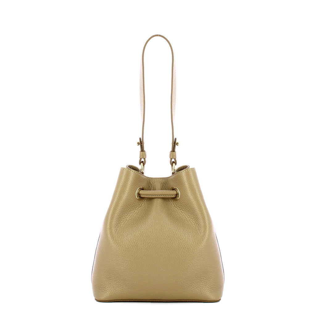 Nodo Armonia Grigio Fossile Bucket Bag Iuntoo, timeless hammered leather accessory with logo on the front. Single handle, drawstring and magnetic closure, lined interior, and small pocket.