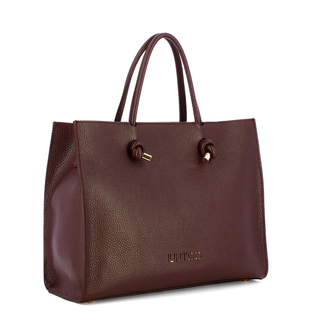 Nodo Armonia Large Bordeaux Handbag Iuntoo, elegant hammered leather shopper with laser-engraved logo on the front, double handles with knots on the ends, and adjustable and removable shoulder strap. Compartment with zip closure, lined interior, and pockets.