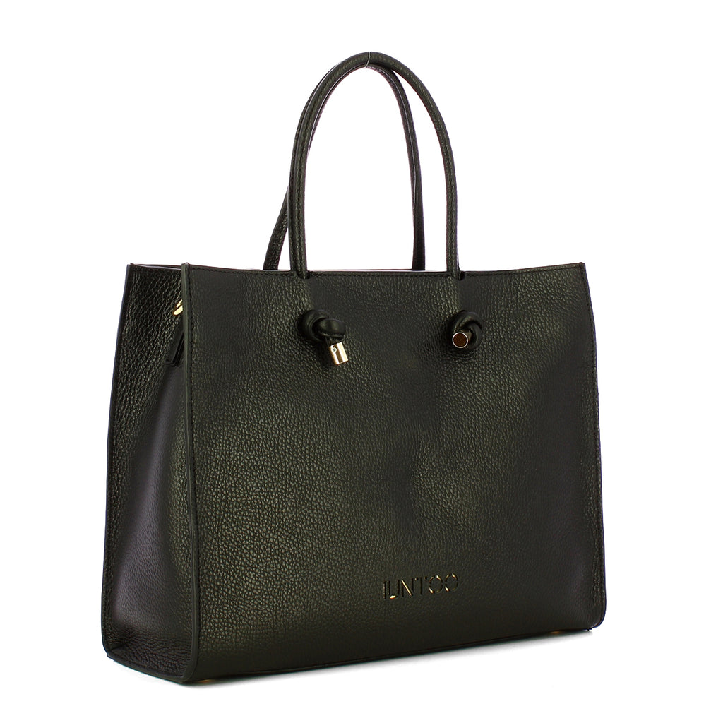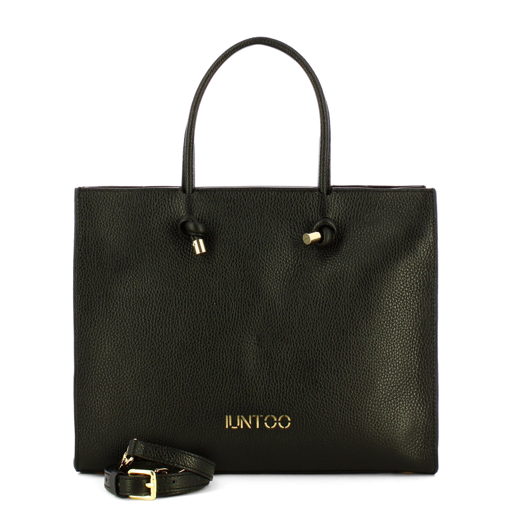 Nodo Armonia Large Nero Handbag Iuntoo, elegant hammered leather shopper with laser-engraved logo on the front, double handles with knots on the ends, and adjustable and removable shoulder strap. Compartment with zip closure, lined interior, and pockets.