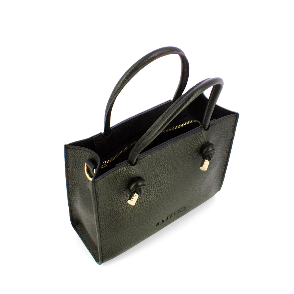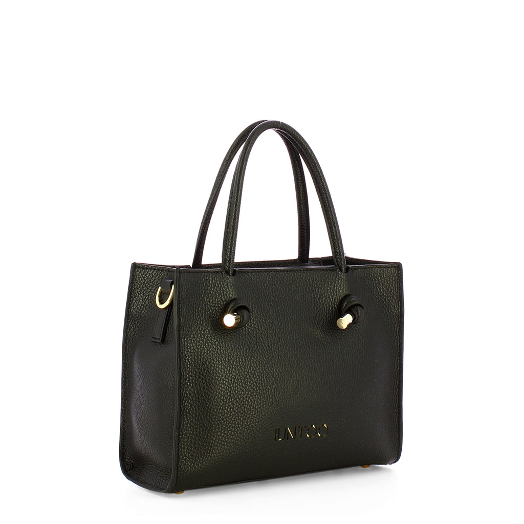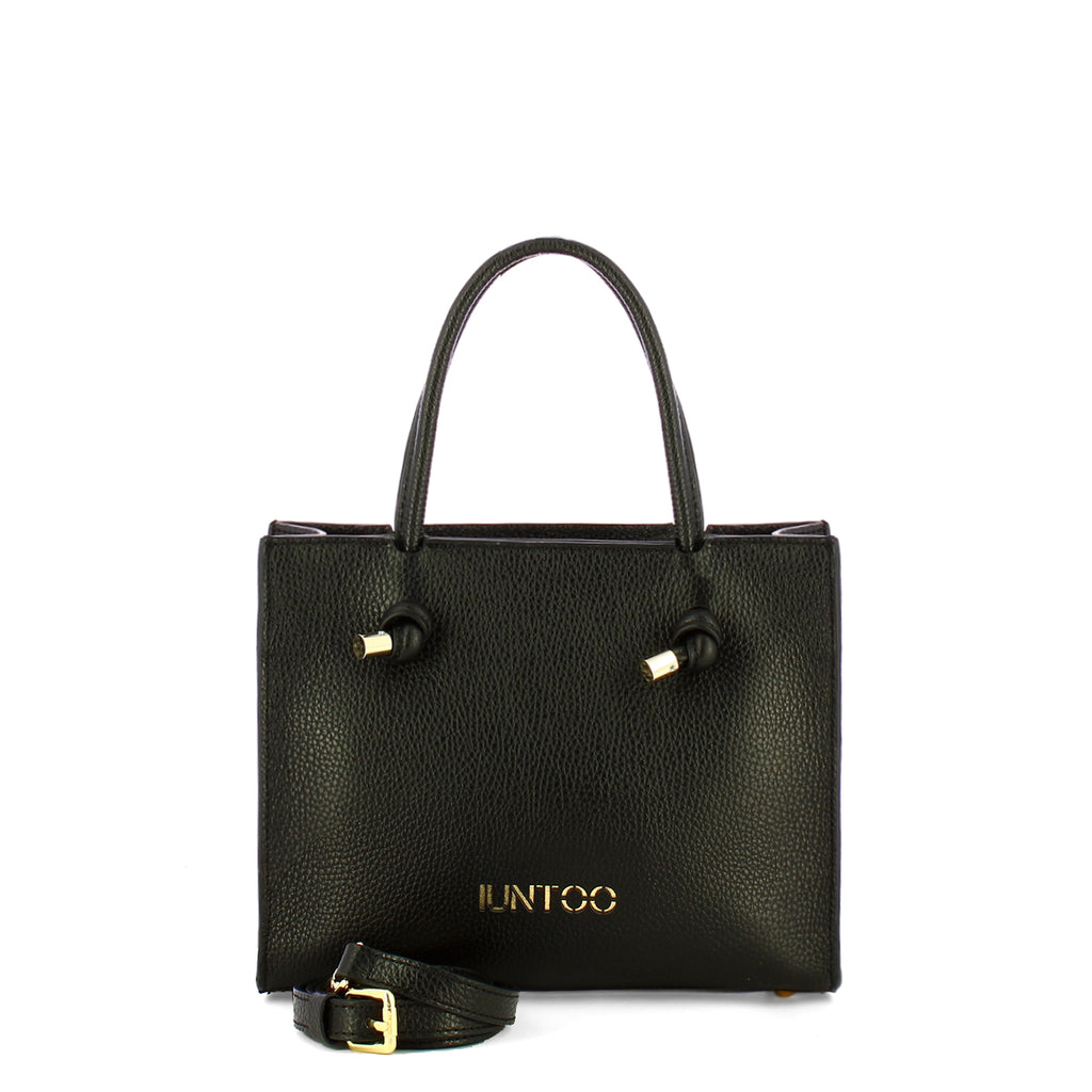 Nodo Armonia Small Nero Handbag Iuntoo, elegant small leather bag with golden metal feet and front laser-engraved logo. Equipped with double handles, and adjustable and removable shoulder strap. Compartment with zip closure, lined interior, and pockets.