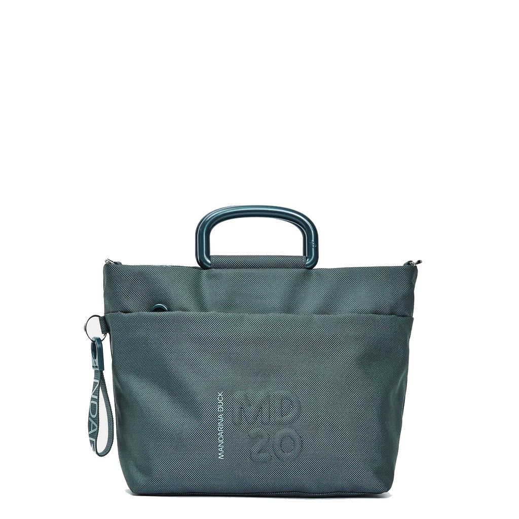 Small Handbag MD20 Pine Green Mandarina Duck, spacious, technical fabric accessory with double handles, external hidden zippered pocket, and adjustable and removable fabric shoulder strap. Main compartment with zip closure, lined interior and pockets.