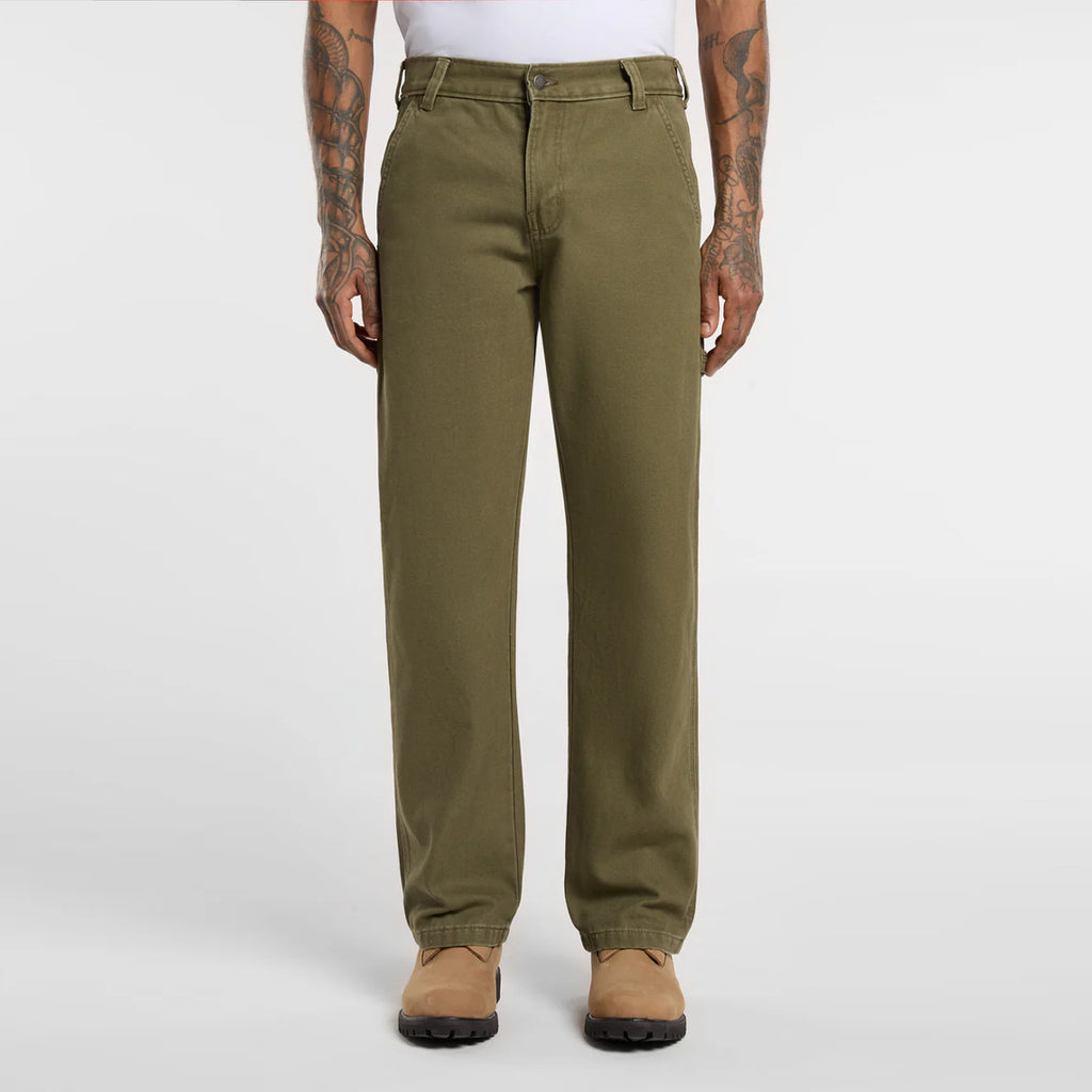 Canvas Carpenter Military Green Trousers Dickies, work-styled inspired trousers made of cotton. Comfy fit. Equipped with pockets, hammer loop, back yoke, ruler pocket, belt loops, zip and button closure.