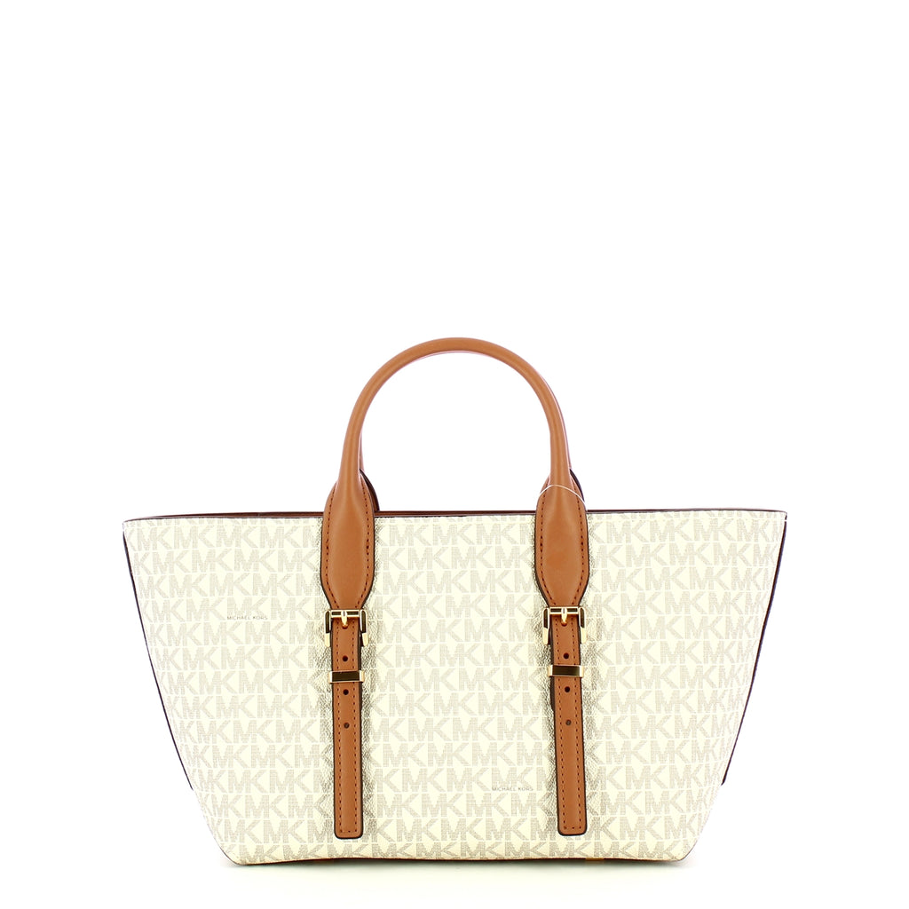 Moore Small Vanilla/Acorn Handbag Michael Kors, spacious logoed faux leather purse with metal feet and metal lettering logo on the front. Double handles, adjustable and removable shoulder strap. Compartment with zip closure, lined interior and zippered pocket.