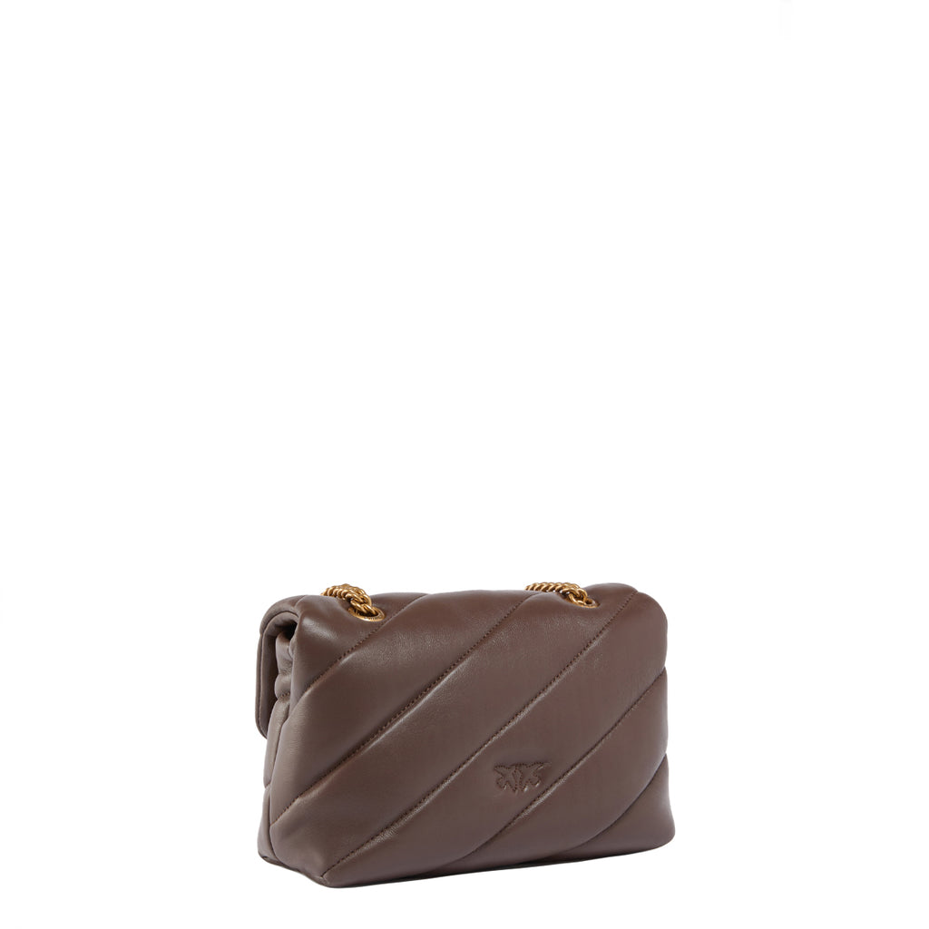 Love Puff Maxi Quilt Marrone Castano Antique Gold Mini Crossbody Bag Pinko, fine and versatile minibag made of genuine leather with soft quilting. Equipped with sliding chain shoulder strap. Compartment with flap closure and golden brushed metal Love Birds Diamond Cut logo.
