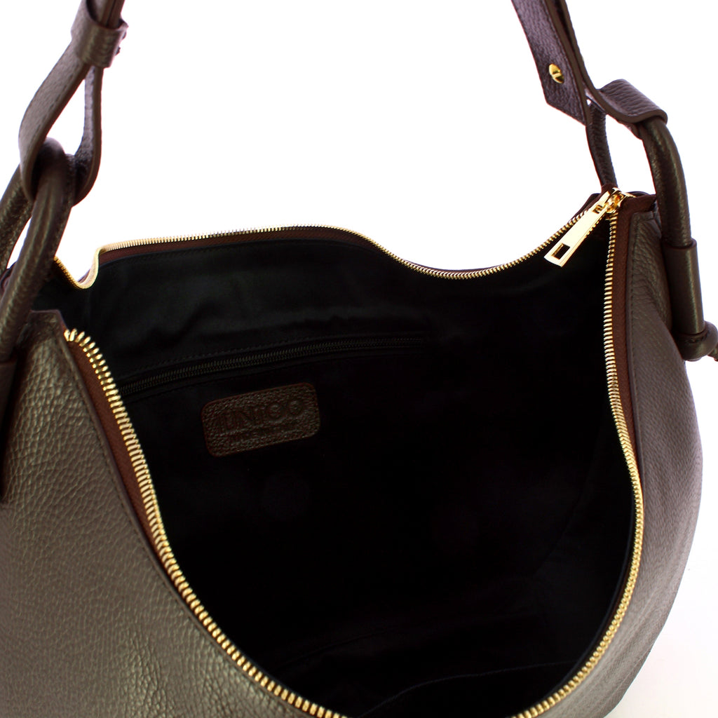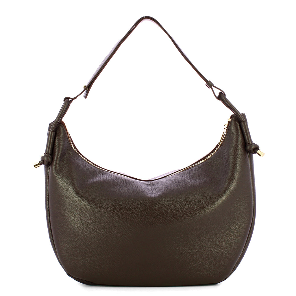 Nodo Armonia Cioccolato Hobo Bag Iuntoo, spacious, soft, hammered leather shoulder bag with laser-engraved logo on the front, single handle, and decorative knots on both sides. Compartment with zip closure, lined interior with pockets, of which one is zippered.
