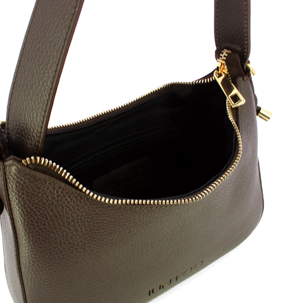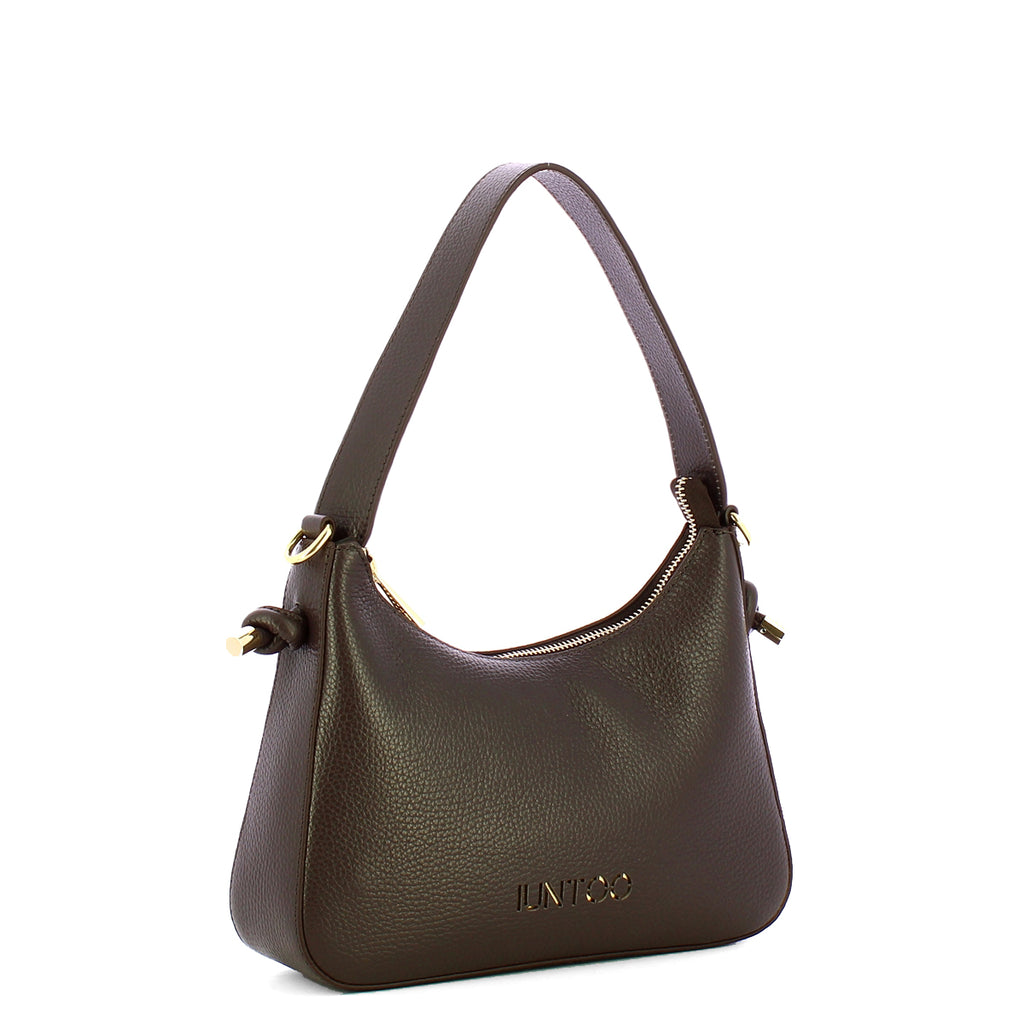 Nodo Armonia Medium Cioccolato Shoulder Bag Iuntoo, elegant, compact, hammered leather hobo bag with laser-engraved logo on the front and decorative knots on both sides. Equipped with top handle, and adjustable and removable shoulder strap. Compartment with zip closure and lined interior.