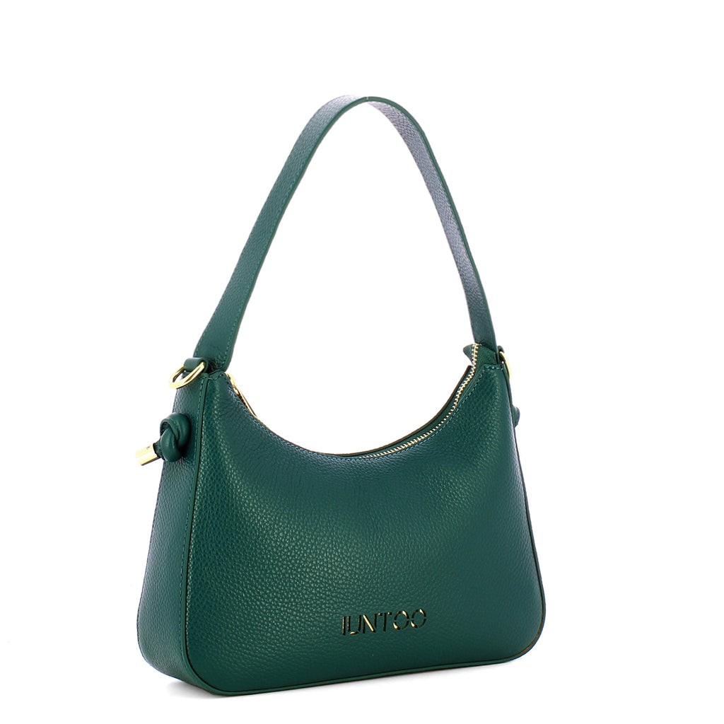 Nodo Armonia Medium Petrolio Shoulder Bag Iuntoo, elegant, compact, hammered leather hobo bag with laser-engraved logo on the front and decorative knots on both sides. Equipped with top handle, and adjustable and removable shoulder strap. Compartment with zip closure and lined interior.